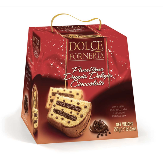 Chocolate Panettone Dolce Forneria with Chocolate chips is one of the most popular all butter Italian Christmas cake, now in a modern packaging suitable for all occasions and ideal as a Xmas food gift.