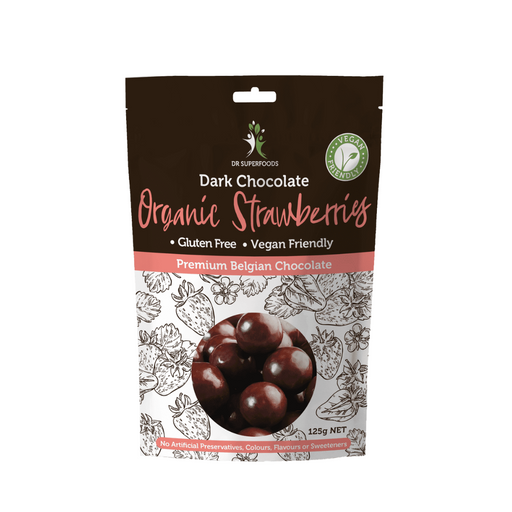 Dr Superfoods Dark chocolate covered Organic strawberries are available to buy online now on Gourmet World.